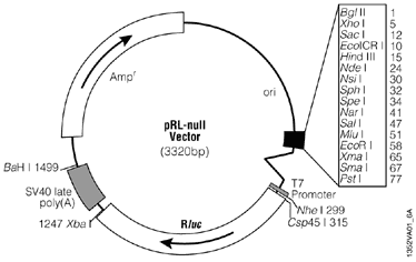 The pRL Vectors are wild-type Renilla luciferase (Rluc) control reporter vectors. The pRL Vectors, which provide constitutive expression of Renilla luciferase, can be used in combination with a firefly luciferase vector to cotransfect mammalian cells. Expression of Renilla luciferase provides an internal control value to which expression of the experimental firefly luciferase reporter gene may be normalized. The pRL Vectors contain the cDNA encoding Renilla luciferase (Rluc) cloned from the anthozoan coelenterate Renilla reniformis (sea pansy).